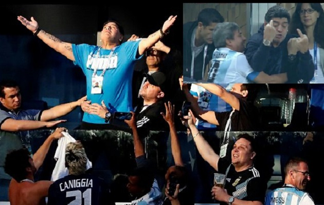 El exfutbolista y exselecionador argentino Diego Armando Maradona fue protagonista este martes durante el Nigeria-Argentina, en el que la Albiceleste logró el pase a los octavos de final del Mundial de Rusia 2018, por su actitud en uno de los palcos del estadio de San Petersburgo.
