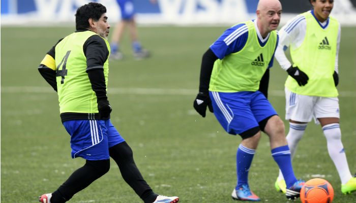 Tras jugar un amistoso con otras "leyendas" y con dirigentes de la entidad que rige el fútbol mundial, Maradona justificó a la prensa su apoyo a la ampliación del número de selecciones.