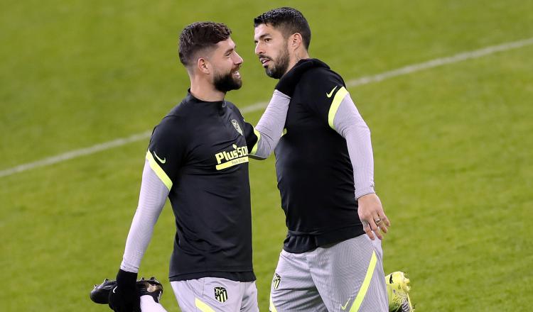 Felipe y Luis Suárez (der.) en los entrenamientos, el uruguayo todavía no ha marcado con los rojiblancos en la Champions. Foto:EFE