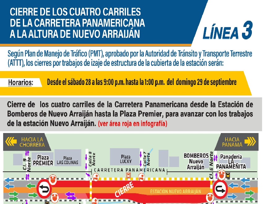 El Metro de Panamá informó sobre un nuevo cierre de los cuatro carriles de la vía Panamericana para avanzar con los trabajos de izaje de estructura de la cubierta, en el distrito de Arraiján, provincia de Panamá Oeste.
