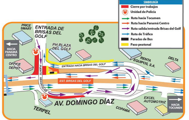 Mientras que en la ruta interna de Bisas del Golf hacia la avenida Domingo Díaz, debe continuar por el puente vehicular que conduce hacia Tocumen; seguir las señales de tránsito que transfieren hacia el puente vehicular de ingreso a Brisas del Golf para retornar a la avenida Domingo Díaz.