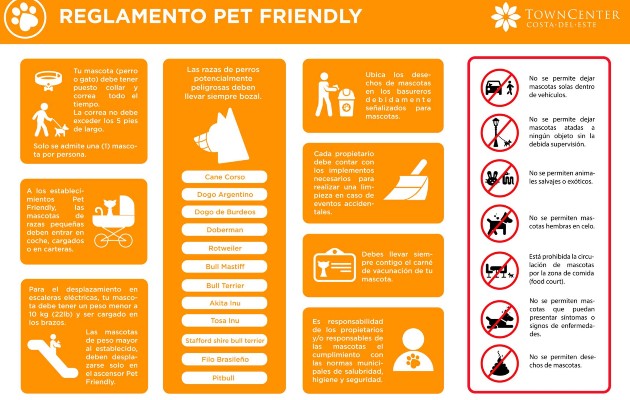 Precisamente, el centro comercial Town Center creó sus propias normas para la visita de las mascotas: ya sea perro o gato debe tener puesto su collar y correa todo el tiempo; las mascotas de raza pequeña deben entrar en coche, cargados o en carteras; las razas de perros potencialmente peligrosos siempre deben llevar bozal; y los propietarios deben portar el carné de vacunación de su mascota.