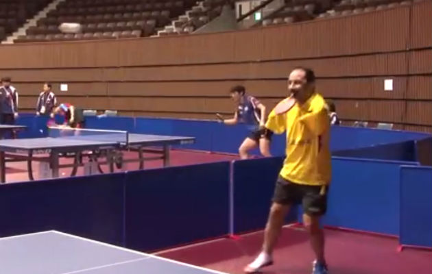 Hamato, controla la raqueta con la boca y se mueve de un lado a otro para golpear el esférico.