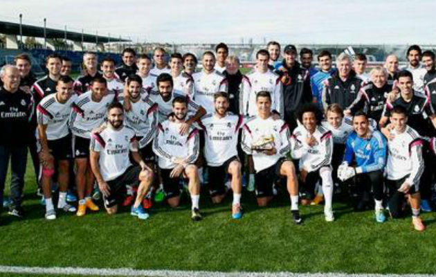 El portugués Cristiano Ronaldo compartió hoy con sus compañeros, al inicio del entrenamiento del Real Madrid, la Bota de Oro 2013 que recibió el miércoles. El artillero luso quiso festejar este nuevo premio con sus compañeros y todo el cuerpo técnico, hacia los que tuvo palabras de agradecimiento en el acto de entrega del galardón. Por ello, Cristiano Ronaldo se fotografió hoy con la Bota de Oro junto a toda la primera plantilla madridista y a los miembros del cuerpo técnico y auxiliares. Posteriormente, el Real Madrid desarrolló el penúltimo entrenamiento de preparación para el próximo partido de Liga, el sábado en el Santiago Bernabéu frente al Rayo Vallecano (20.00). En la sesión preparatoria participaron también los jugadores del Real Madrid Castilla lvaro Medrán y Sergio Aguza, según informa el club.
