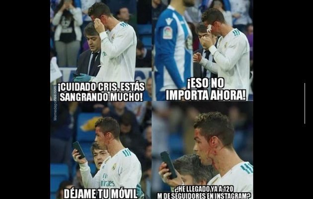 A seis minutos del final del partido y con la goleada del Real Madrid al Deportivo la Coruña (7-1), Cristiano recibió un golpe fortuito del central suizo Fabian Schär al rematar de cabeza el sexto tanto madridista, que le abrió la ceja y provocó que se retirase a los vestuarios sangrando en abundancia.