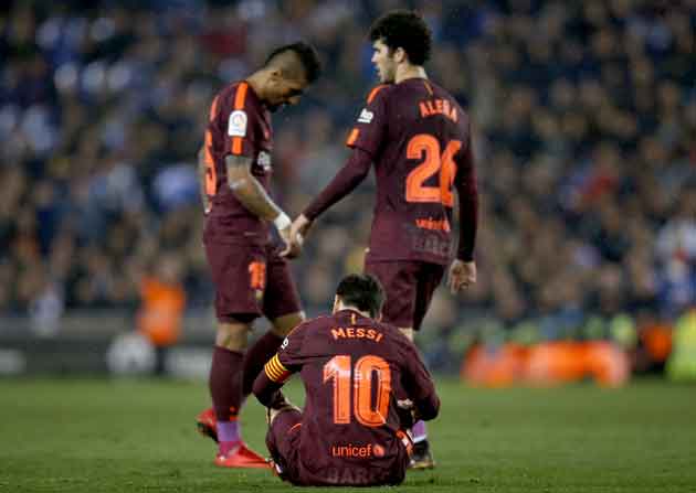 Messi sentado en el césped del estadio del Espanyol. Foto EFE