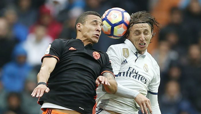 o Santiago Bernabéu, Santi Mina tuvo en su mano poner en ventaja al Valencia al primer minuto de juego, pero el costarricense Keylor Navas salvó la doble ocasión del atacante gallego, y el Madrid fue madurando el partido con dos remates de Karim Benzema, neutralizados por Diego Alves, concediendo apenas un despiste defensivo sobre el chileno Fabián Orellana, quien disparó pésimo con la zurda.