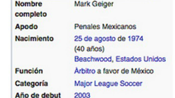 En la ficha de Geiger apareció lo siguiente: le apodan ‘Penales Mexicanos’, y tiene como ocupación ‘Árbitro a favor de México’.