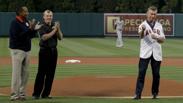 El legendario pelotero panameño atestiguó el momento en que Ralf, padre del jugador de la NFL que le donó el corazón y un riñón, hizo el primer lanzamiento ceremonial, previo al juego de los Angelinos.