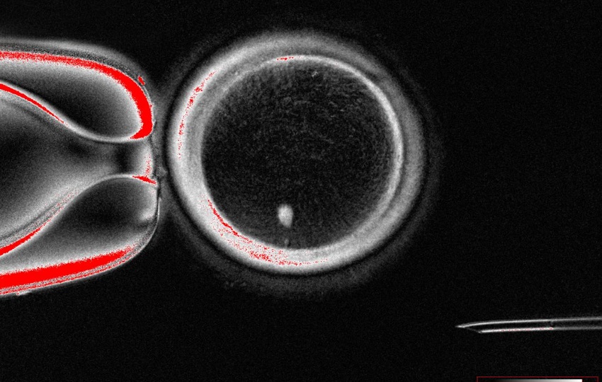 Ovocito humano con transferencia nuclear de células somáticas con huso visible (punto brillante en el interior) antes de la fecundación. Foto: EFE