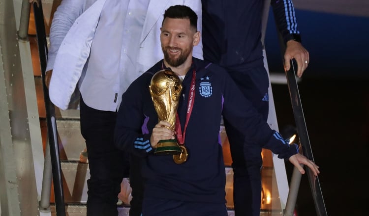 Messi a su llegada a Buenos Aires, Argentina con la Copa del Mundo. Foto:EFE