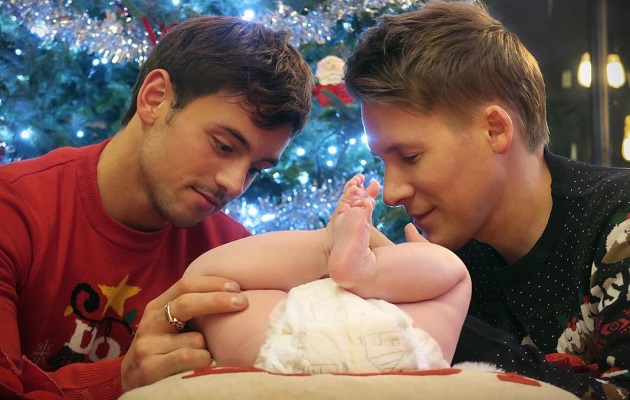 El nadador olímpico Tom Daley y su esposo Dustin Lance Black compartieron una tierna foto de Navidad de su hijo Robbie, de seis meses. Esta será la primera fiesta de fin de año que la pareja pasará como padres.