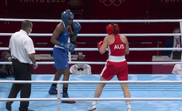 La boxeadora panameña Atheyna Bylon (azul), aprovechó su distancia y venció de forma contundente por (5-0) a la australiana Caitlin Parker en su debut a los Juegos Olímpicos de Tokio 2020.