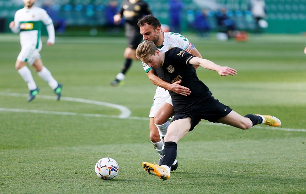 Un tanto del centrocampista holandés Frenkie De Jong en el minuto 38 dio ventaja al Barcelona en una primera parte en la que el conjunto catalán fue dueño y señor del juego pero sin apenas chispa ni profundidad más allá de las aventuras individuales de Dembélé ante un Elche replegado que ha esperado su oportunidad al contragolpe.