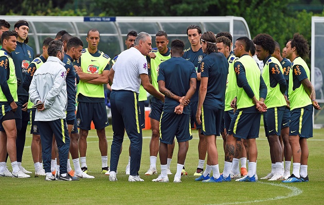 Tite conversa con sus jugadores durante el entrenamiento en Londres. Foto EFE
