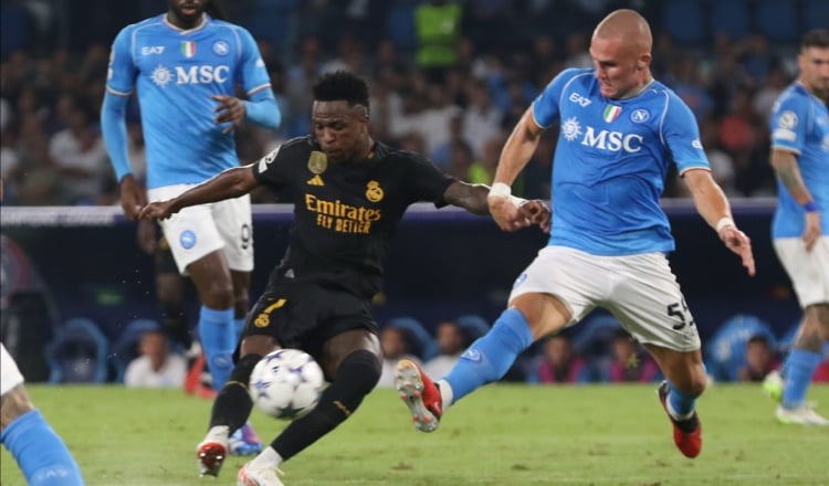 Vinicius Junior del Real Madrid disputa un balón contra el defensa Leo Ostigard del Nápoles. Foto: EFE