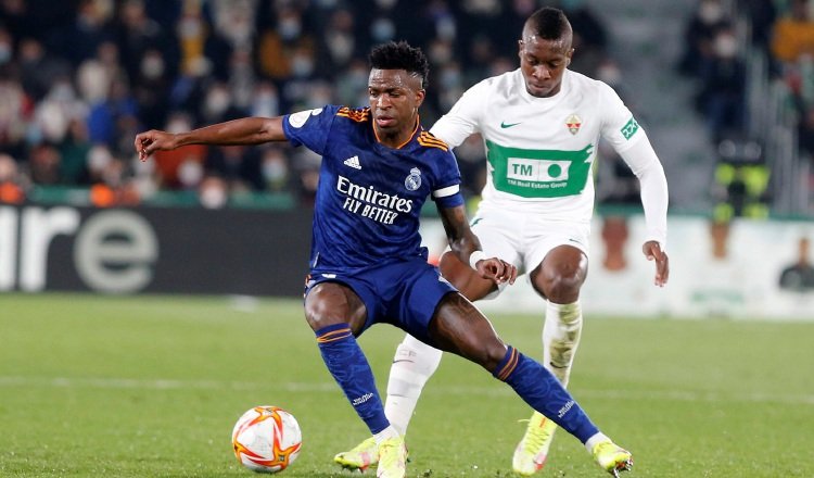 El brasileño del Real Madrid, Vinicius Jr. (i), con el balón ante el defensa colombiano del Elche, Helibelton Palacios. Foto:EFE