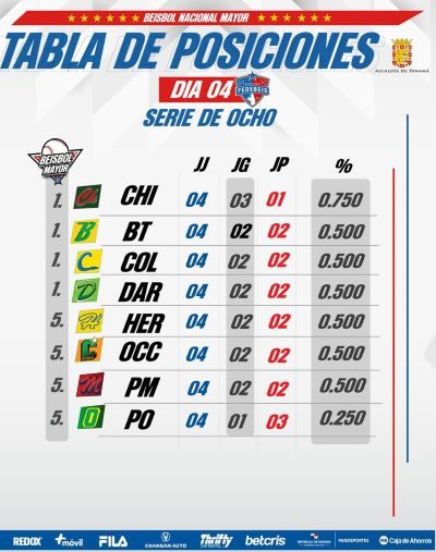 Chiriquí con su triunfo ante Colón queda con marca de 3-1 en ganados y perdidos, para tomar el liderato de la Ronda de Ocho Equipos en el Béisbol Mayor
