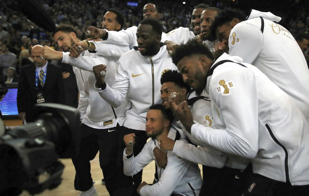 Jugadores del Golden State Warriors muestran el anillo de campeones de la NBA. Foto:AP