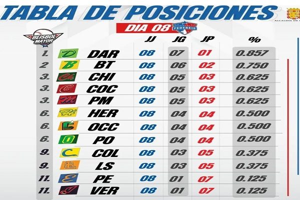 La novena de las 'Águilas Harpías' solo has perdido un partido en ocho fechas jugada, para comandar la tabla de posiciones del béisbol mayor al tener marca de 7 partidos ganados y una sola derrota para un promedio de 0.857 en la clasificación general.