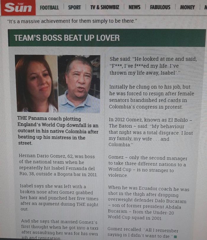 "Isabel (víctima de Hernán Gómez) dice que se quedó con la nariz rota después de que Gómez la agarró del pelo y la golpeó cinco veces después de una discusión", relata The Sun, cuyos periodistas estuvieron alrededor de una semana en Panamá investigando diferentes aspectos relacionados al fútbol de Panamá.