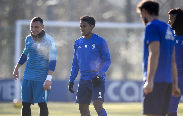El futbolista, reconocido por la afición como el mejor jugador del mes de enero, apuntó al grupo como el responsable de su reconocimiento individual y afirmó que se encuentra muy cómodo en Oviedo y no piensa en qué ocurrirá con su futuro a partir de junio.