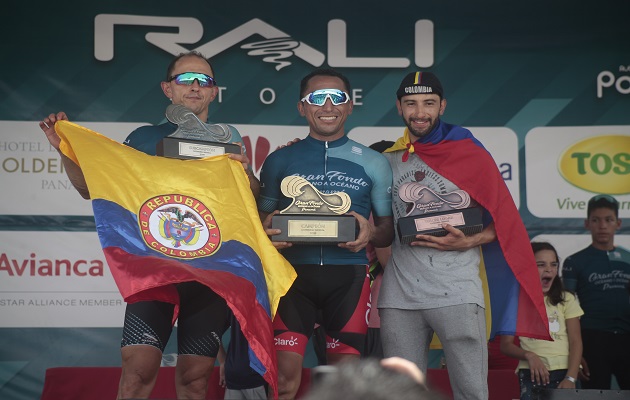 Jaime Rivas (cent.) festeja su triunfo en Océano a Océano. Foto: Víctor Arosemena