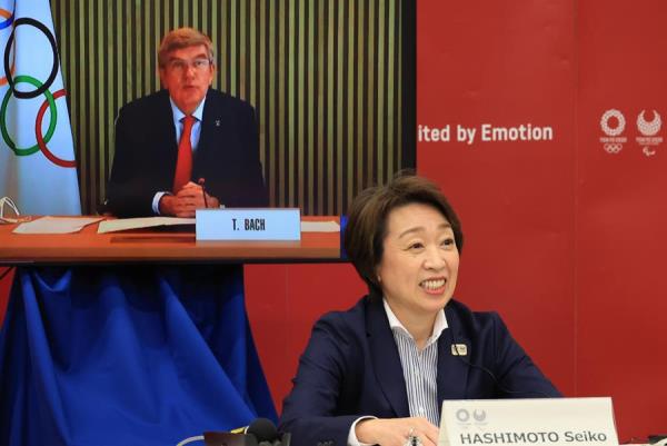 Thomas Bach (en la pantalla), presidente del Comité Olímpico Internacional,y la presidenta del Comité Organizador de Tokyo 2020, Seiko Hashimoto, durante la reunión.