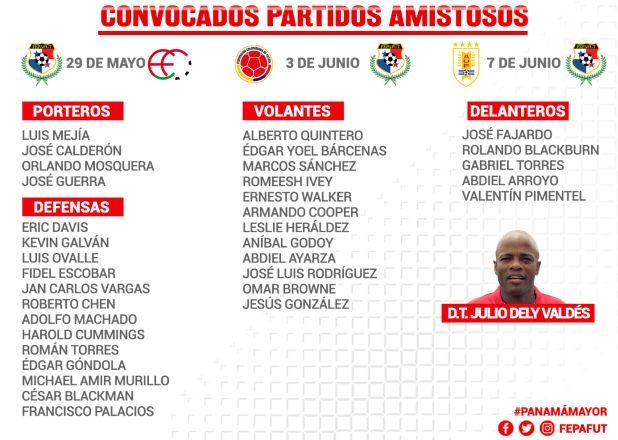 Julio Dely Valdés, técnico de la selección nacional, presentó el listado de los jugadores convocados elegibles de Panamá con miras a encarar los duelos de preparación ante el País Vasco (29 de mayo), Colombia (3 de junio) y Uruguay (7 de junio), informó la Federación Panameña de Fútbol.