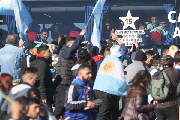 Pese a las restricciones por la pandemia del coronavirus vigentes, muchos hinchas se volcaron a las calles para saludar el paso de los campeones que en dos micros recorrieron los casi dos kilómetros que separa el Aeropuerto internacional del Predio de la Asociación del Fútbol Argentino (AFA), ambos en la localidad bonaerense de Ezeiza.