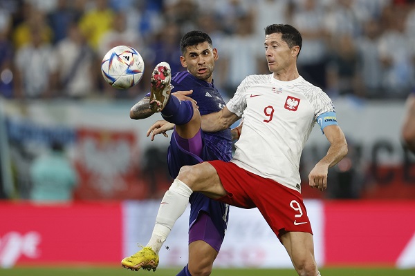 Robert Lewandowski de Polonia (9) disputa un balón con Cristian Romero de Argentina. Foto: EFE