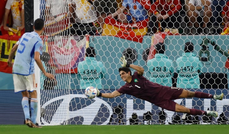 Yassine Bounou (Bono) de Marruecos detiene un penalti a Sergio Busquets de España. Foto:EFE