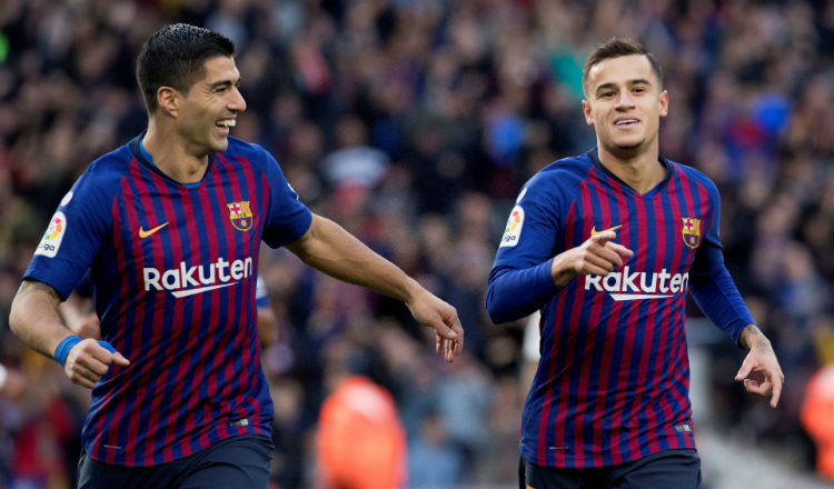 Luis Suárez y Coutinho (D) autores de los goles del Barcelona en el primer tiempo. Foto EFE