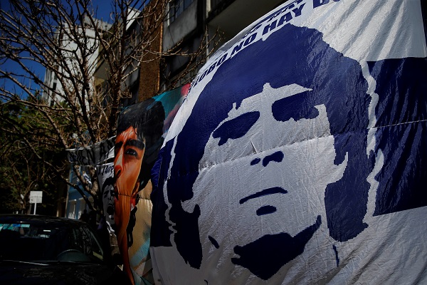 A PLATA (ARGENTINA), 03/11/2020.- Seguidores despliegan pancartas frente a la clínica donde permanece internado el exfutbolista argentino Diego Maradona. Foto:EFE
