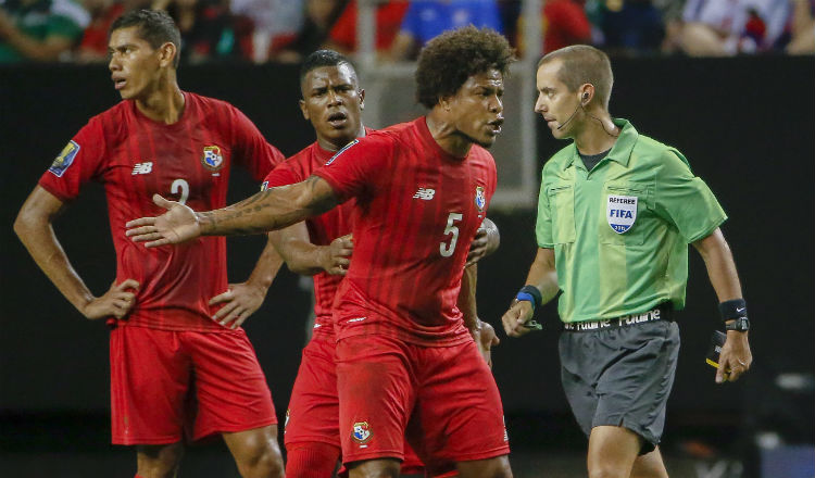 Román Torres de Panamá discute con el árbitro Mark Geiger. Foto:EFE