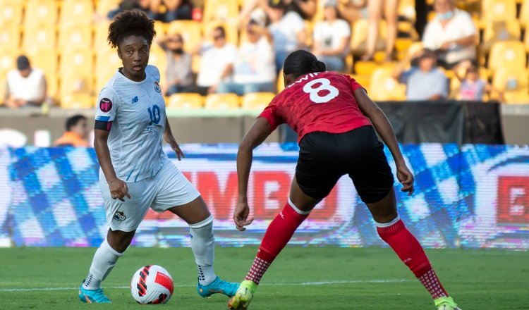 Marta Cox (10) de la selección femenil de Panamá disputa el balón con Victoria Swift de la selección de Trinidad y Tobago. Foto:EFE