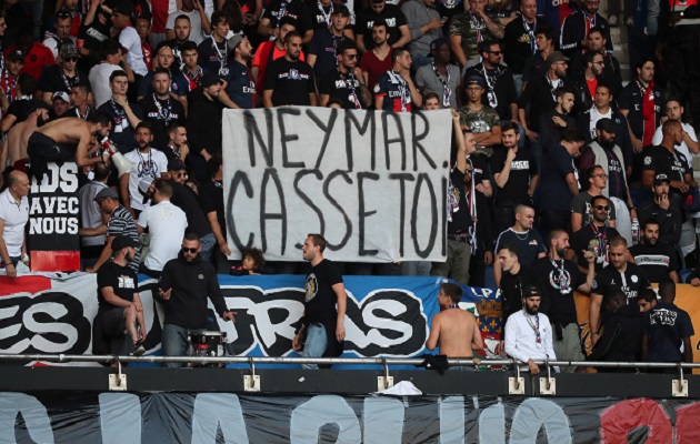 Los aficionados parisinos cantaron en varios momentos del choque "Neymar hijo de put..." en castellano y mostraron pancartas con un mensaje para el jugador sudamericano: "Neymar, lárgate".