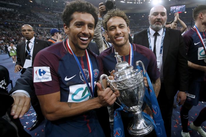 Neymar Jr. junto a su compañero Marquinhos celebrando con el trofeo. EFE