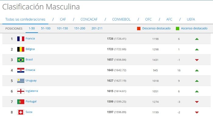 Francia pasa a encabezar la clasificación y le sigue Bélgica. Por Concacaf, México está en el puesto 16.