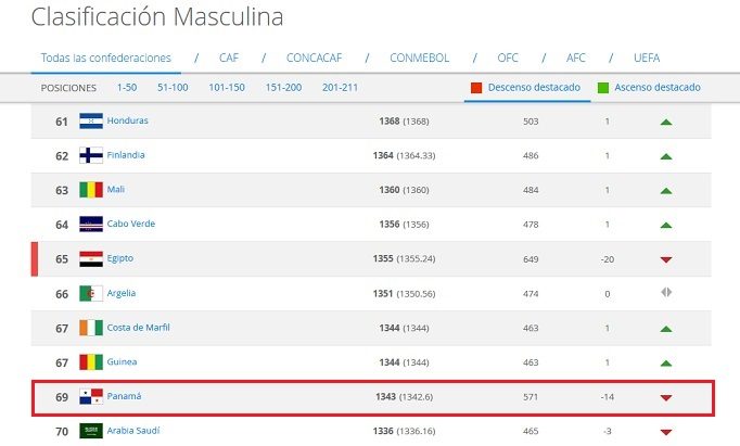 La selección de Panamá, que en el pasado mundial fue dirigida por el colombiano Hernán “El Bolillo” Gómez cayó 14 puestos en la clasificación ya que antes de iniciar el torneo se encontraba en el puesto 55.
