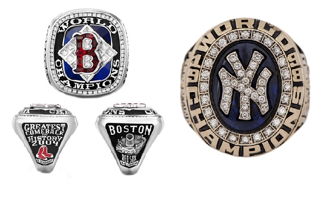 Anillos de Serie Mundial que conquistaron los Yankees de Nueva York en 1998 y los Medias Rojas de Boston en 2004.