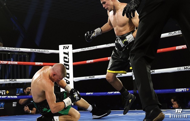 Zepeda, que casi cae fuera del cuadrilátero, sobrevivió a un conteo del árbitro Kenny Bayless. Luego tomó aire y de un zurdazo al mentón de Baranchyk finalizó con el pleito.