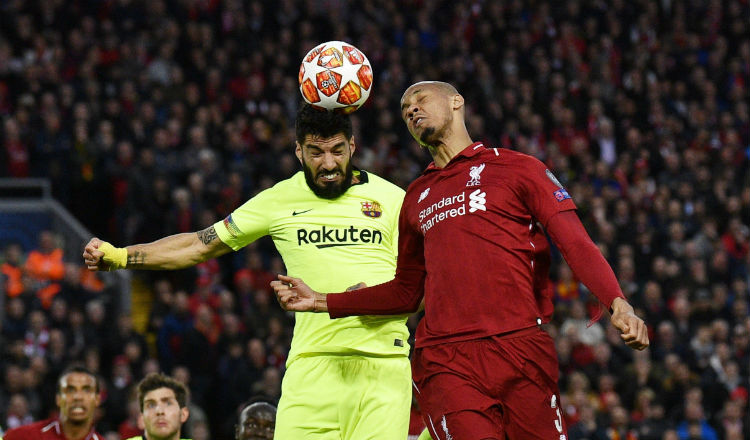 Luis Suárez intenta ganar el balón ante Fabinho. Foto EFE