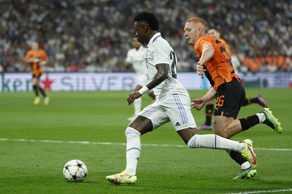 El delantero del Real Madrid Vinicius Jr. (i) se escapa de Yukhym Konoplia, del Shakhtar Donetsk, durante el partido de Liga de Campeones. Foto: EFE