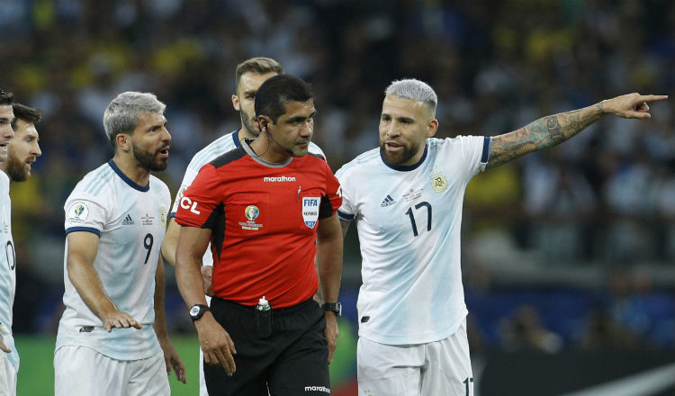 Jugadores argentinos hacen reclamos al árbitro ecuatoriano Roddy Zambrano. Foto AP