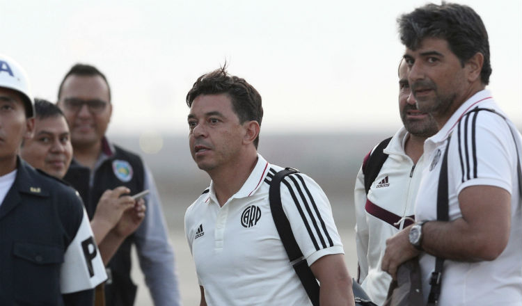 Marcelo Gallardo (c) a la llegada del técnico argentino a Lima donde River Plate jugará la final contra el Flamengo. Foto AP