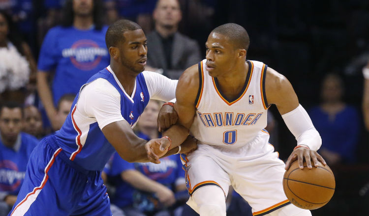 Russell Westbrook es marcado por el veterano Chris Paul. Foto AP