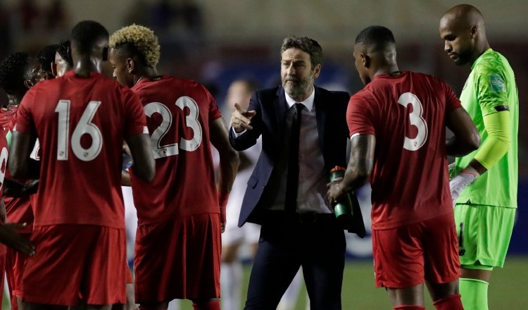 Thomas Christiansen, técnico de Panamá habla con los jugadores. Foto:EFE