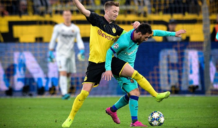 Marco Reus disputa (izq.) el balón ante Messi. AP