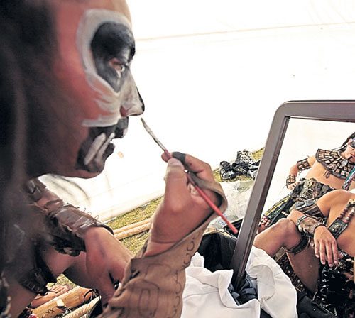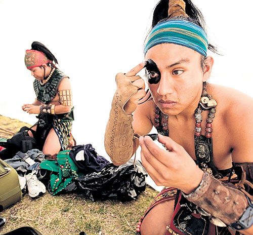Llevaban los rostros y el pecho pintados de negro y blanco, y vestían pectorales, cintos con ídolos y rodilleras.